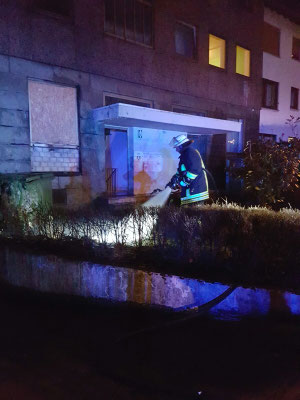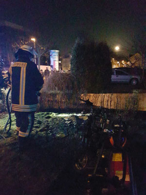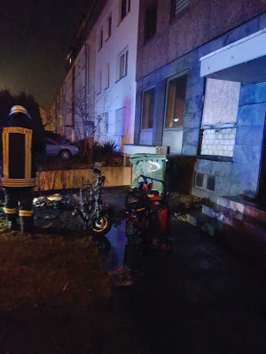 Die ersteintreffende Einheit Lengsdorf fand einen Großbehälter für Grünabfall und einen Haufen Altpapier sowie einen dabeistehenden Motorroller und teilweise die das Grundstück umgebende Hecke brennend vor.